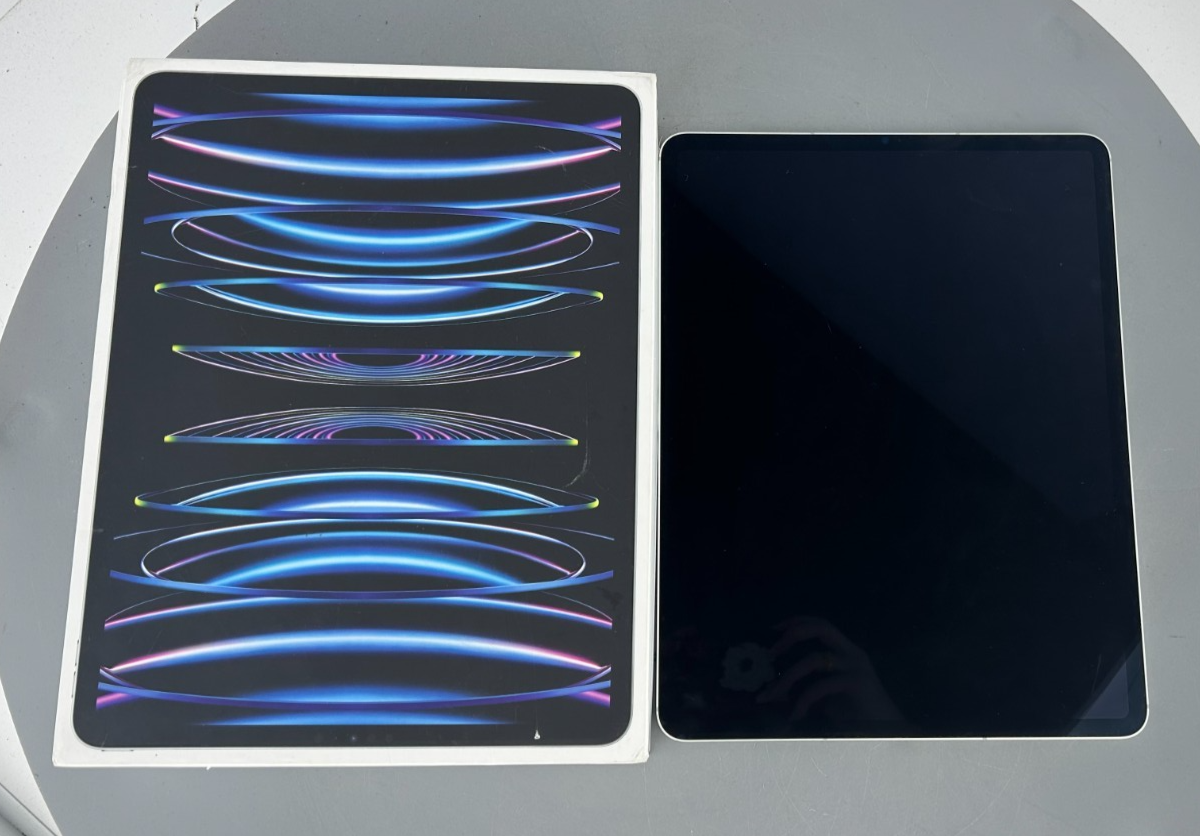 Preowned, in good condition. The iPad has no noticeable marks or scratches and comes with a blue case.